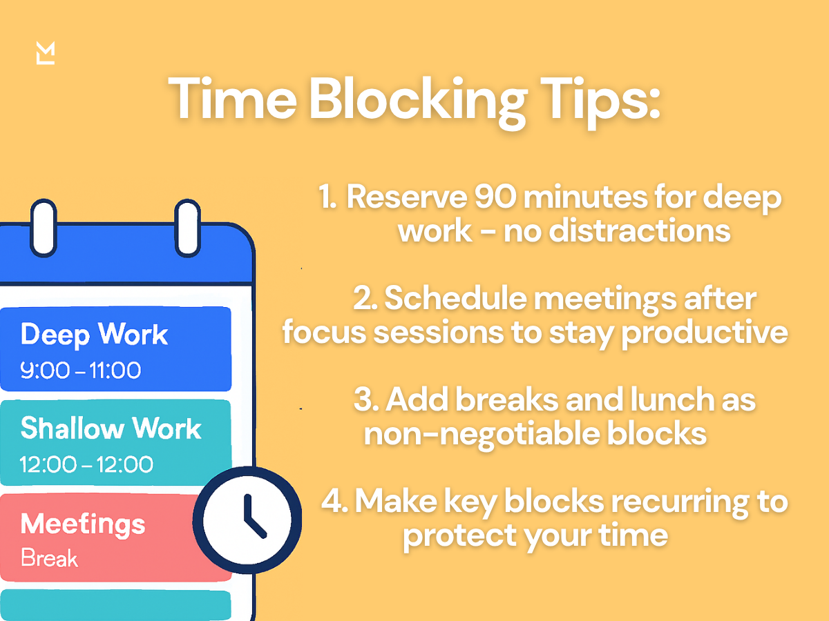 Instead of a traditional to-do list, time blocking schedules everything - deep work sessions, meetings, email checks, breaks, and personal time. It creates structure and ensures your highest-priority tasks get dedicated attention.