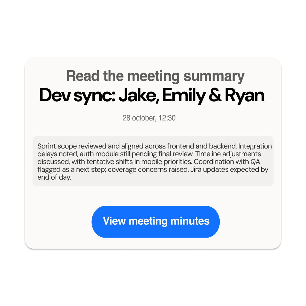 Missing key decisions can lead to wasted work, sprint delays, and expensive rework. AI-powered transcription captures every word, while instant summaries surface the most important takeaways. Managers can quickly review what matters, assign tasks confidently, and keep the team moving without missing a beat.
